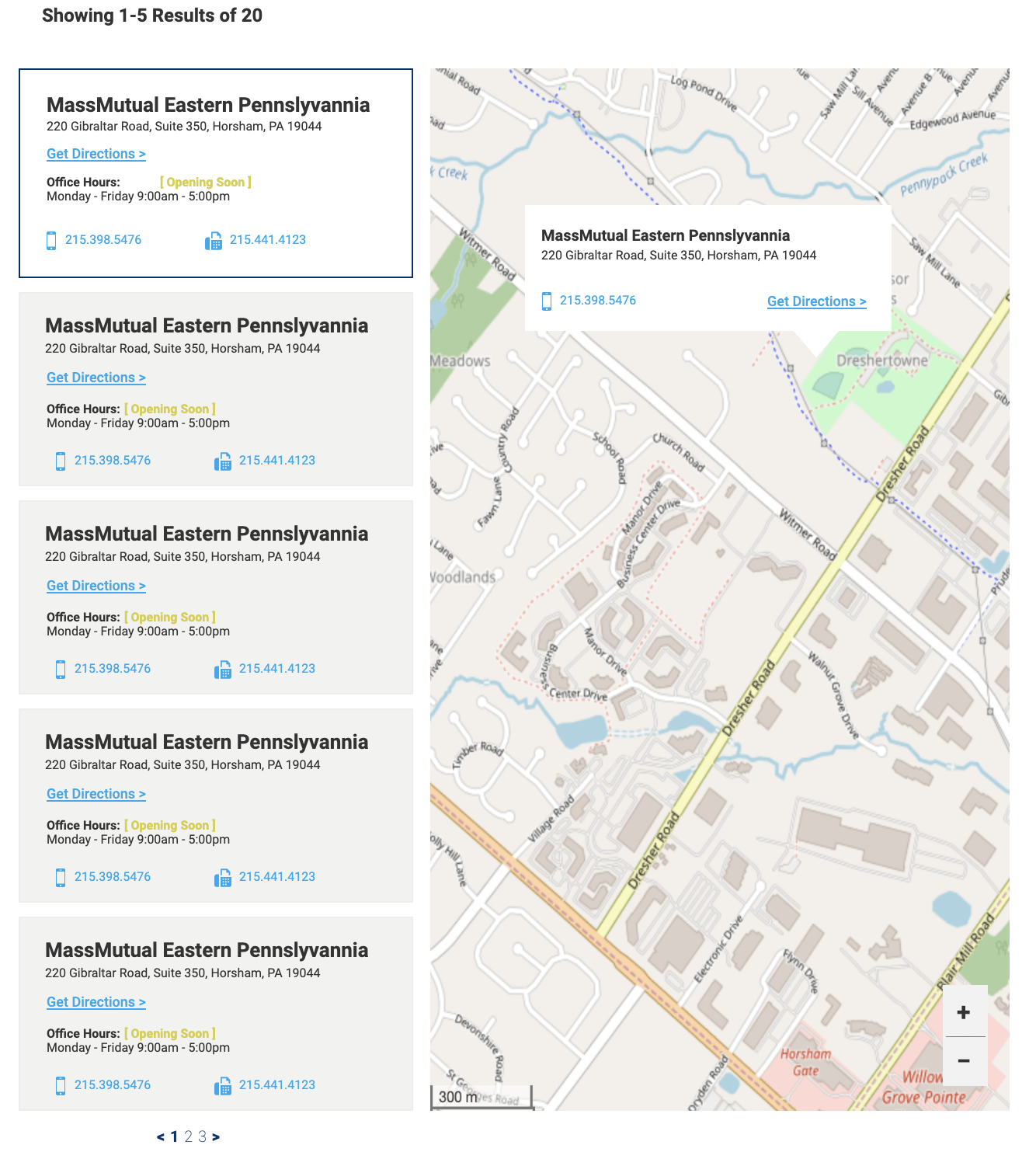 Analytics showed that engagement was low because there was a lack of functionality. We decided to implement two new user-driven search capabilities: an employee listing search and an office location search. The employee listing search functionality allows users to easily search for a local employee with the option to filter by employee type and/or area of focus and see employees and their contact information at a glance. The office location search functionality allows users to easily search for an office location and see office location contact information and map location at a glance.